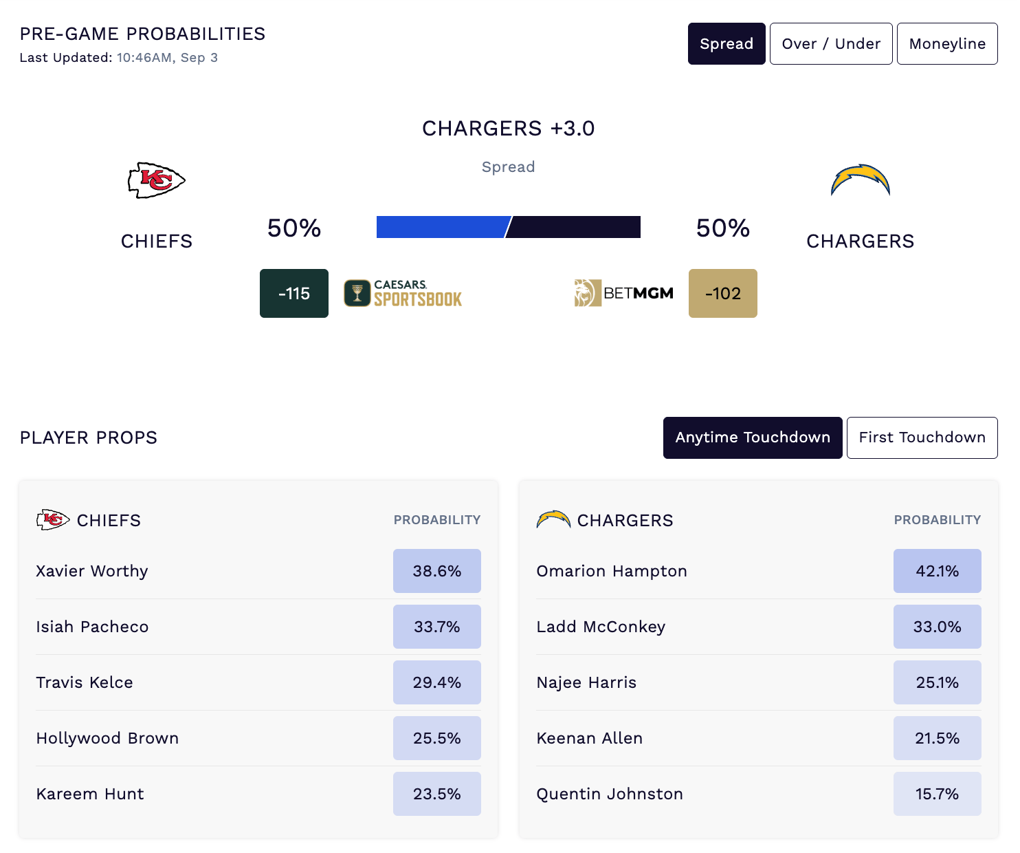 If you are a live bettor looking to capitalize, or looking to arb in and out of a position, both teams now have a chance to score touchdowns or more in Overtime.